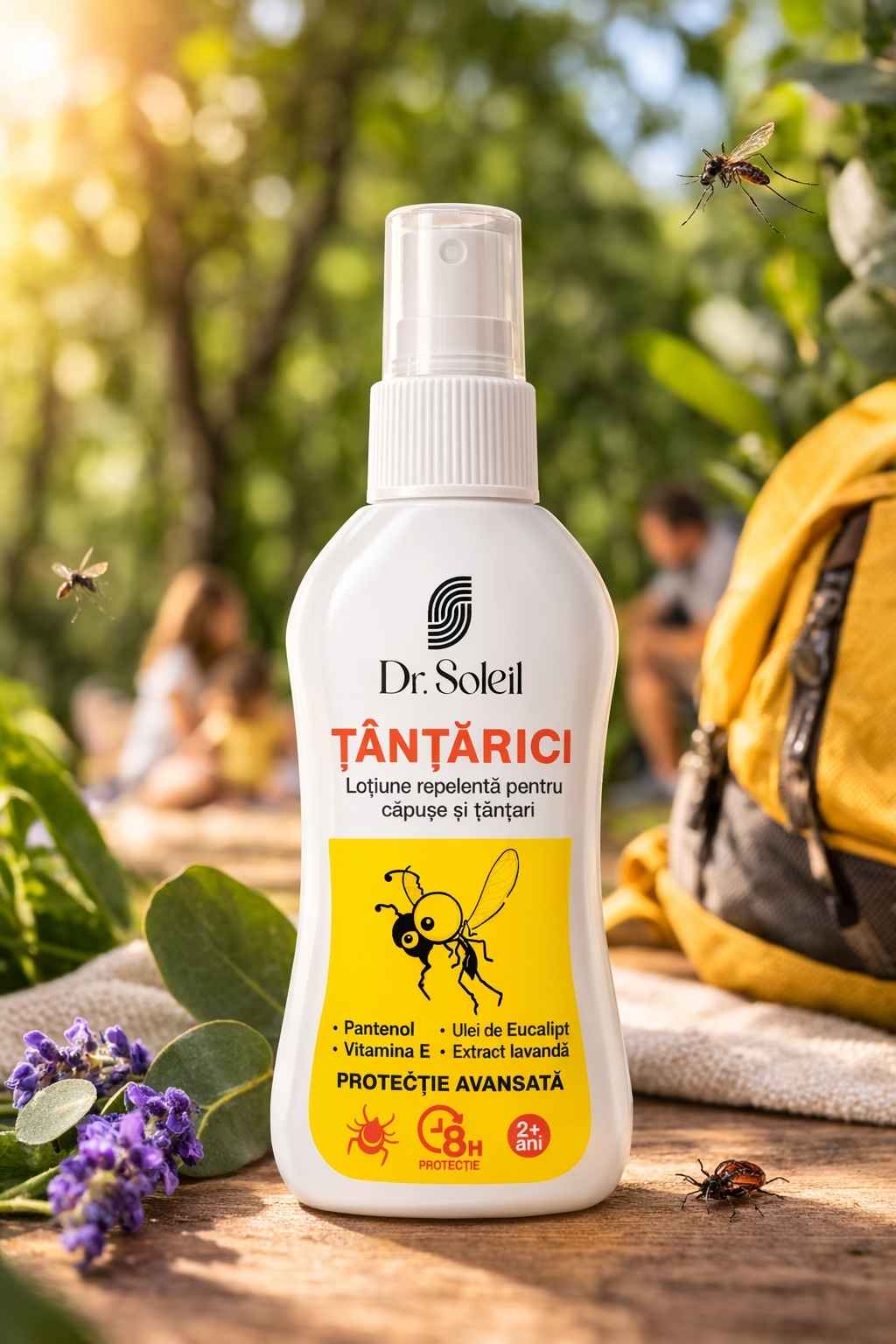 Loțiunea repelentă Dr. Soleil Tântărici este un produs biocid cu protecție avansată, conceput pentru a oferi siguranță maximă împotriva țânțarilor și căpușelor în condiții de expunere intensă. Ideală pentru activități în aer liber precum drumeții, pescuit sau camping.