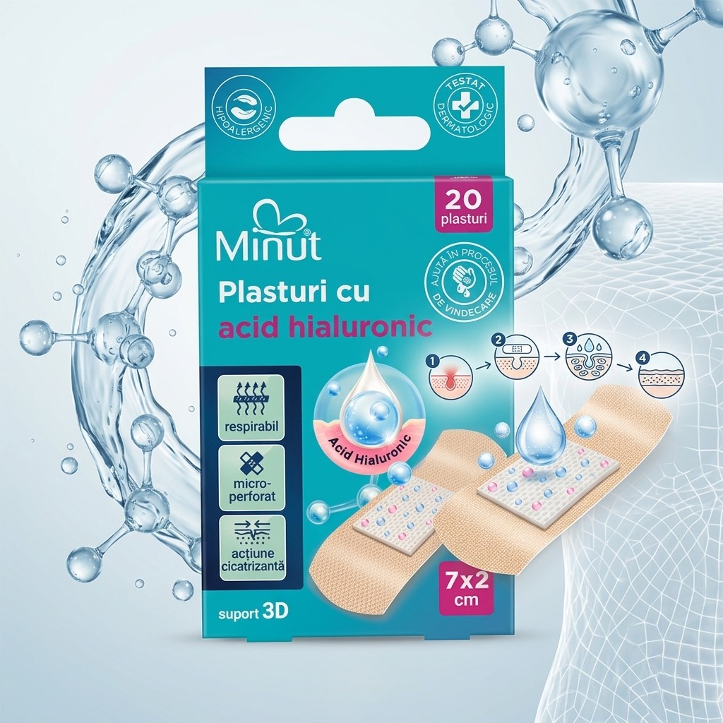 Plasturii cu Acid Hialuronic Minut sunt special concepuți pentru a accelera procesul natural de vindecare a rănilor superficiale. Aceștia utilizează un strat protector 3D care creează un mediu optim, hidratat, favorizând repararea țesuturilor și reducând riscul de infecție.